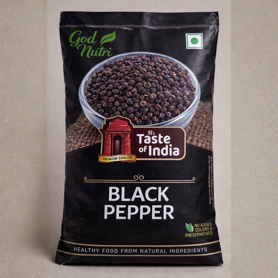 God Nutri Black Pepper (Kali Mirch) is made from premium-quality peppercorns known for their strong aroma and bold flavour. Hygienically packed, naturally pure, and free from added colors or preservatives — perfect for everyday cooking and wellness.